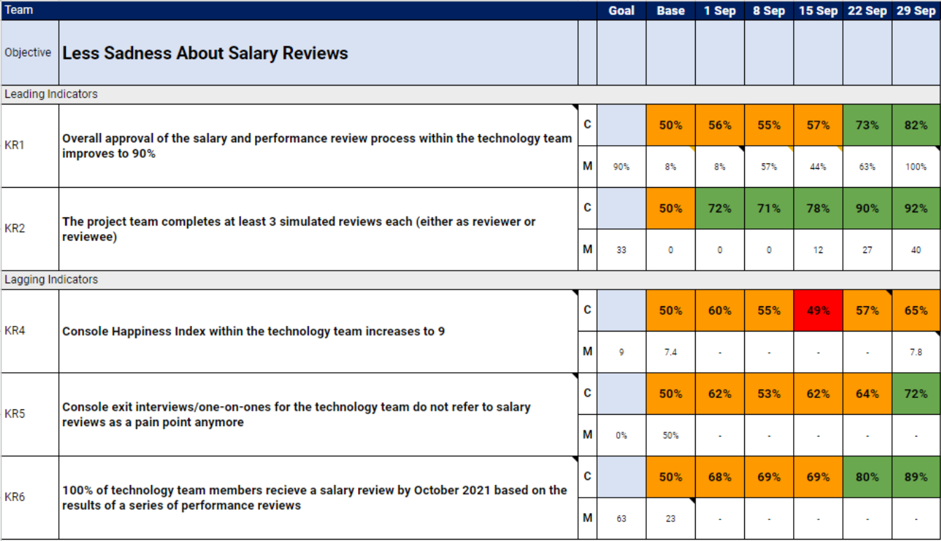 - Overall approval of the salary and performance review process within the technology team, measured via survey, improves from <10% to 90%