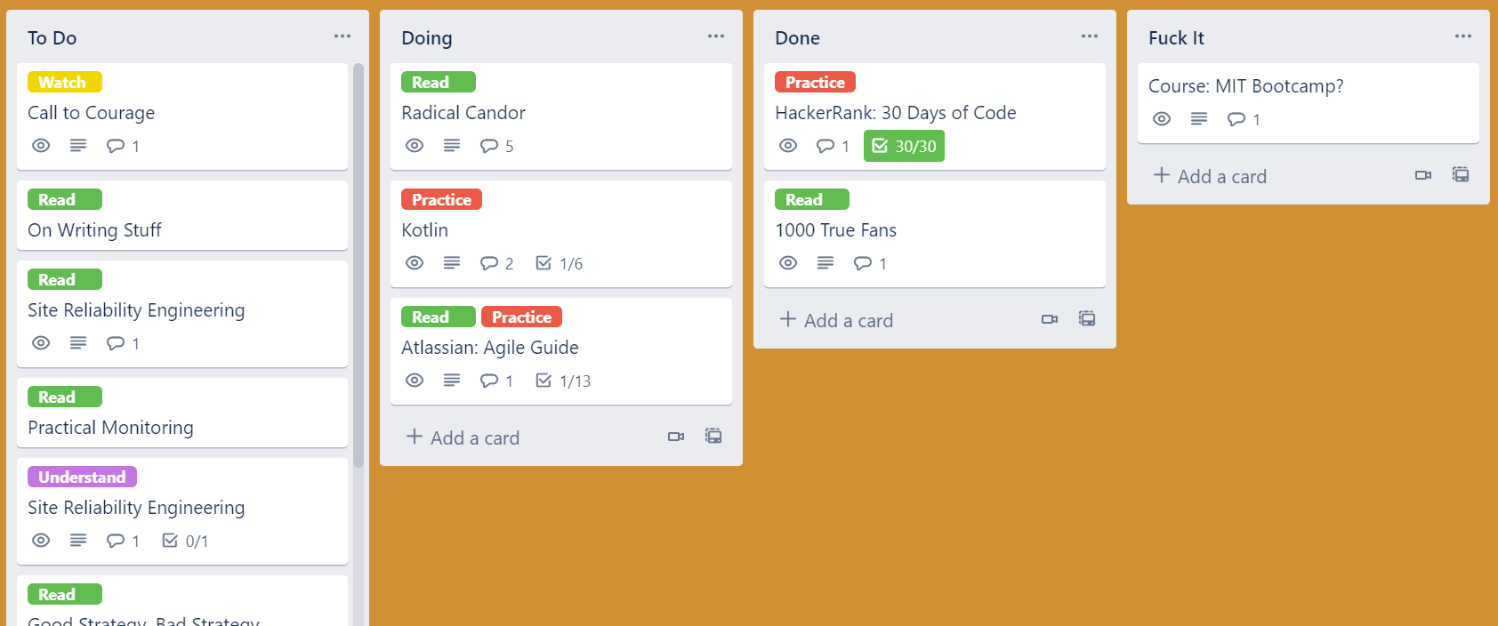My personal backlogs all follow a simple workflow of To Do -> Doing -> Done, along with the ability to give up on things (Abandoned). This workflow is represented as columns on the board and gives me enough flexibility to organise myself while not being too prescriptive or complicated.