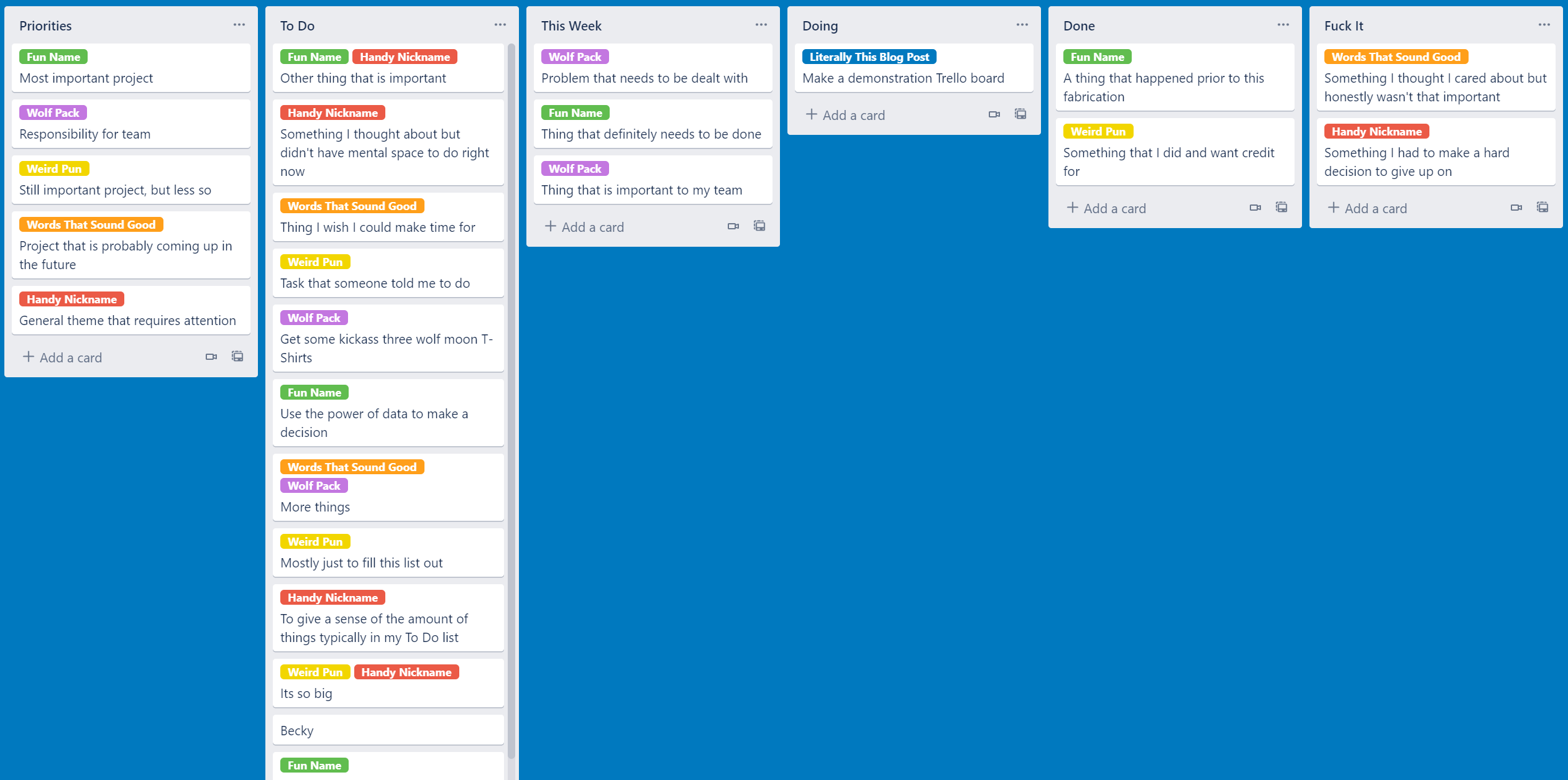 Putting it all together, the board that I use for my work backlog looks something like this: