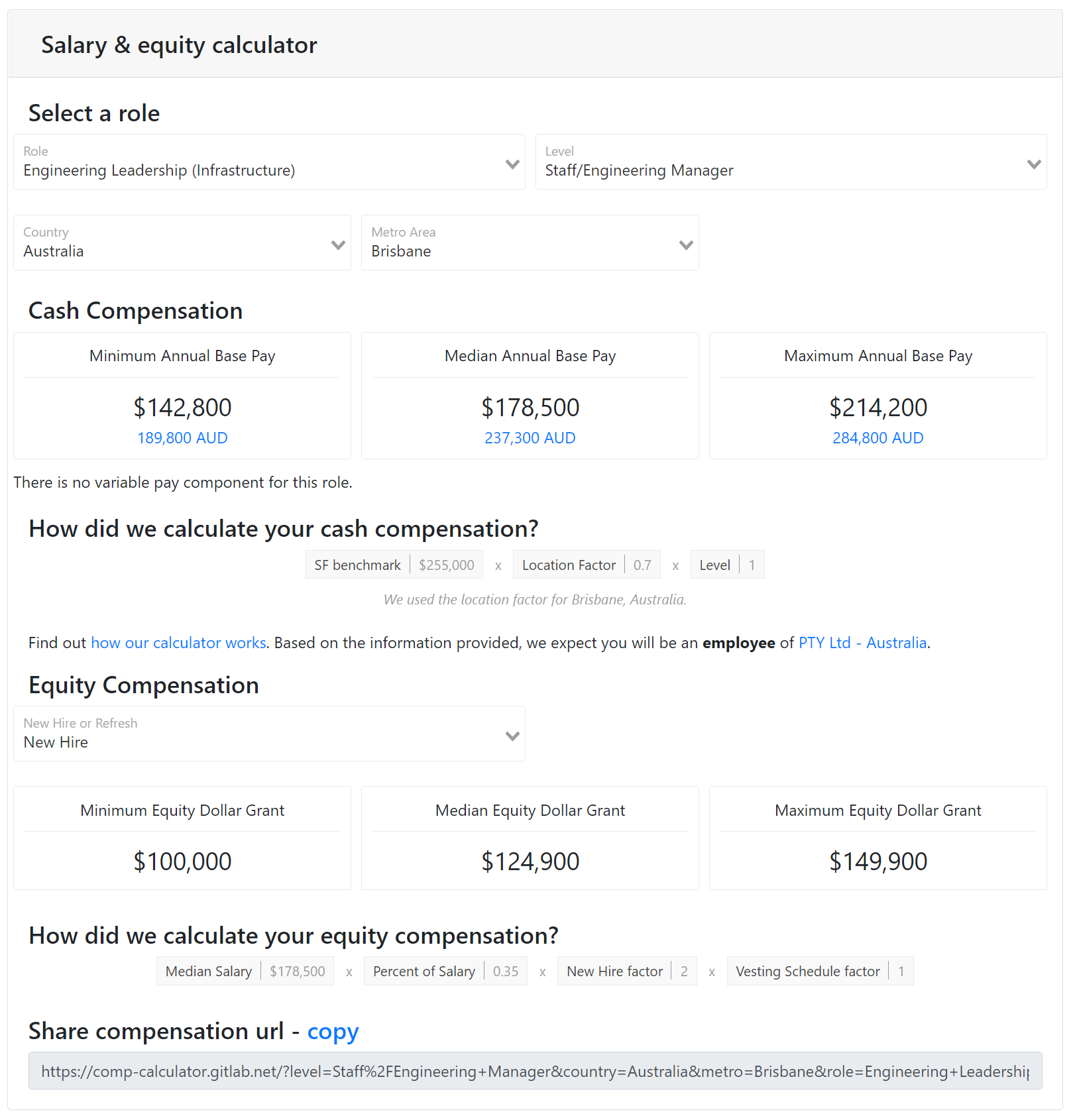 The recruiter was personable, intelligent, well-informed, and asked good questions. More importantly, at the end of the screening process, when it was obvious that I wasn't a raging psychopath to be avoided at all costs, the recruiter invited me into the Gitlab Compensation Calculator and talked openly about the salary bands that I would fit into if I was successful, along with any equity that I would be eligible for.